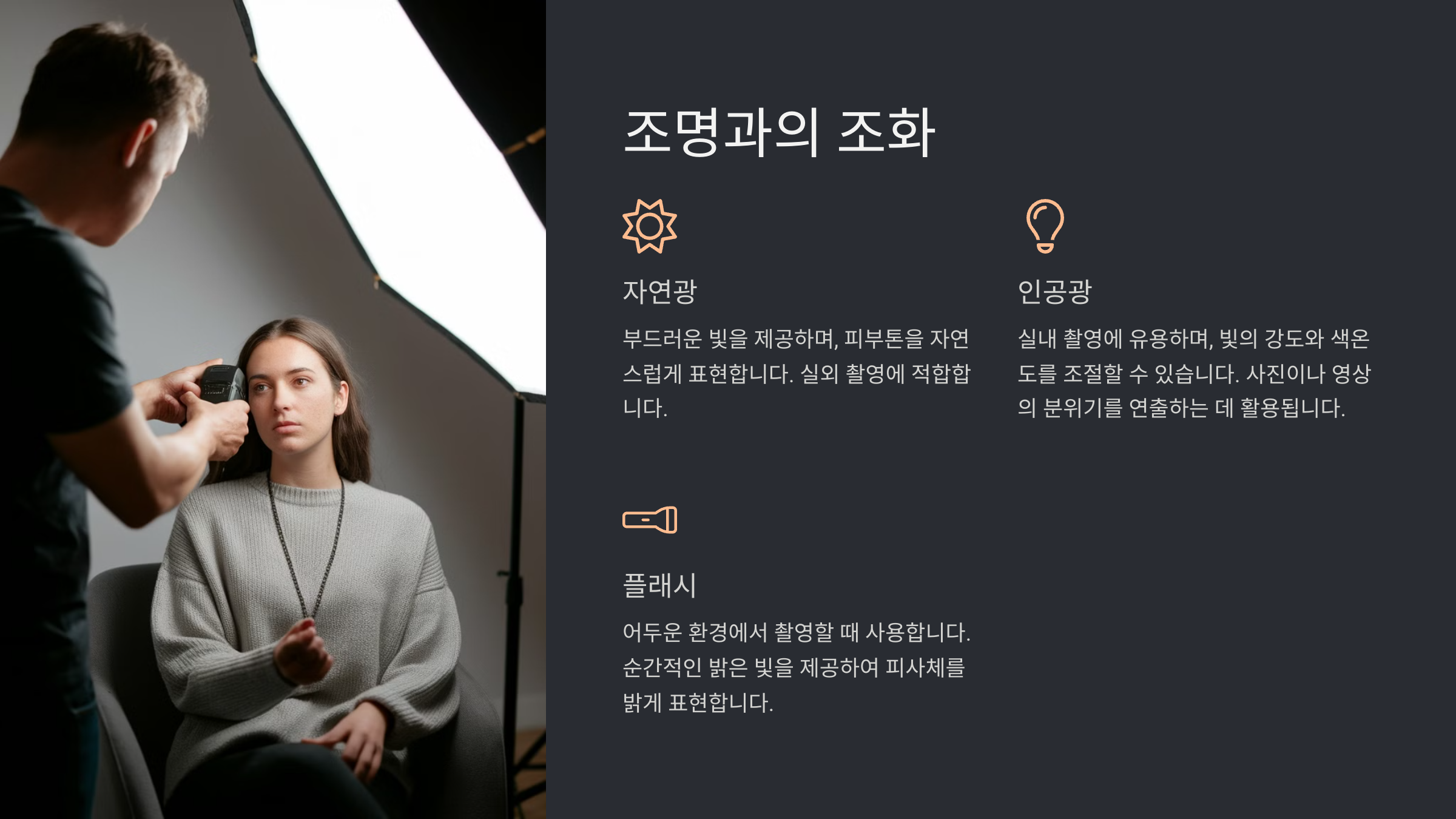 1. 자연광 활용: 자연광을 사용할 때는 카메라가 빛을 등지지 않도록 배치하세요. 얼굴이 그림자로 가려질 수 있어요.