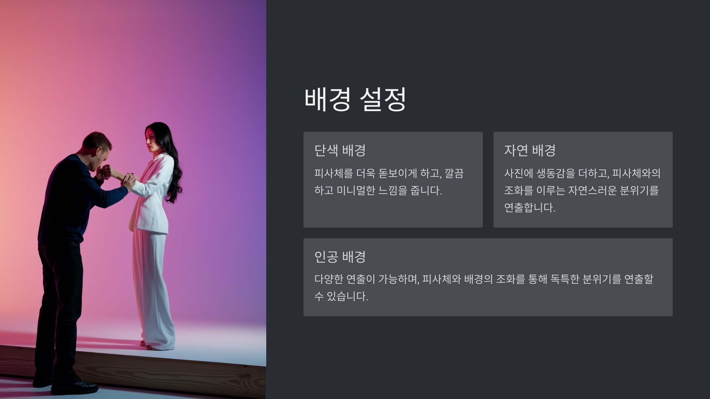 1. 단순한 배경: 벽이나 커튼처럼 단색의 배경을 사용해요. 복잡한 배경은 시청자의 주의를 산만하게 만들 수 있어요.