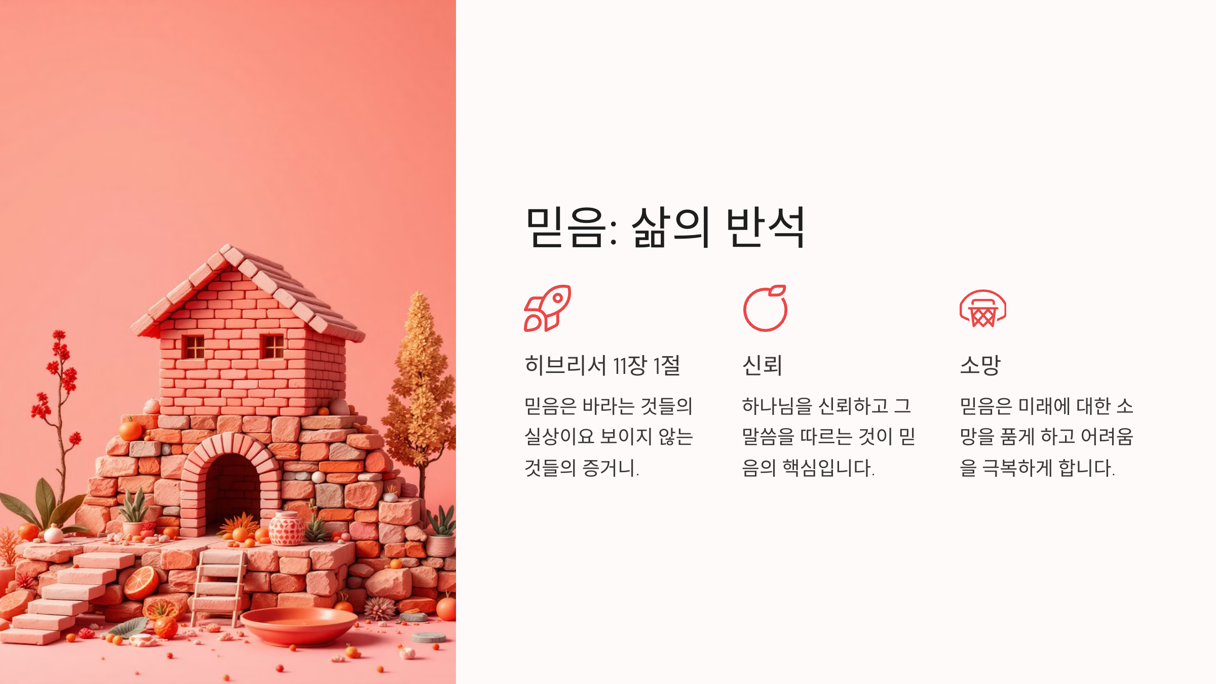 믿음은 신앙의 기초이며, 하나님과의 관계를 더욱 깊게 해주는 중요한 요소예요. 우리의 삶 속에서 믿음을 지켜나가기 위해 성경 속 말씀들을 묵상해 볼까요?