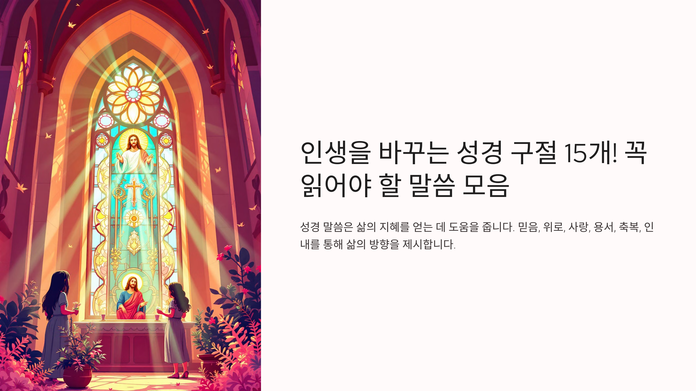 오늘은 여러분의 인생을 변화시킬 수 있는 성경 구절 15개를 소개할게요. 이 말씀들이 여러분의 삶 속에서 빛과 소망이 되길 바라며, 신앙을 더욱 깊이 다지는 계기가 되길 소망합니다.🙏